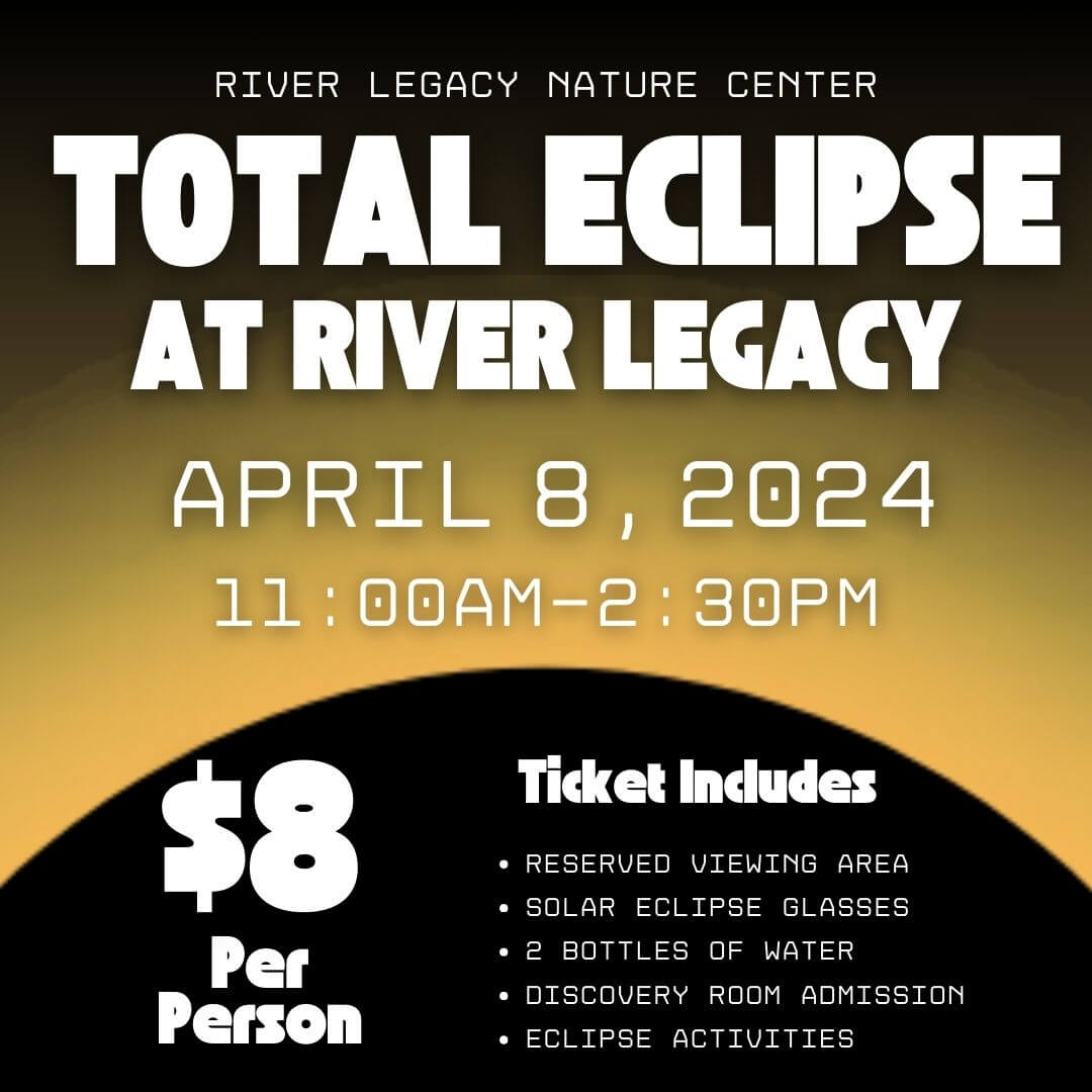 Come experience the Solar Eclipse with all of us here at River Legacy on April 8th. 11:00 AM – 2:30 PM